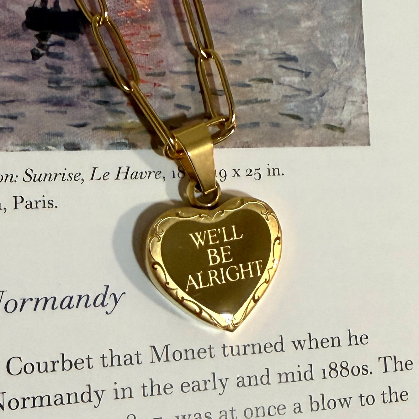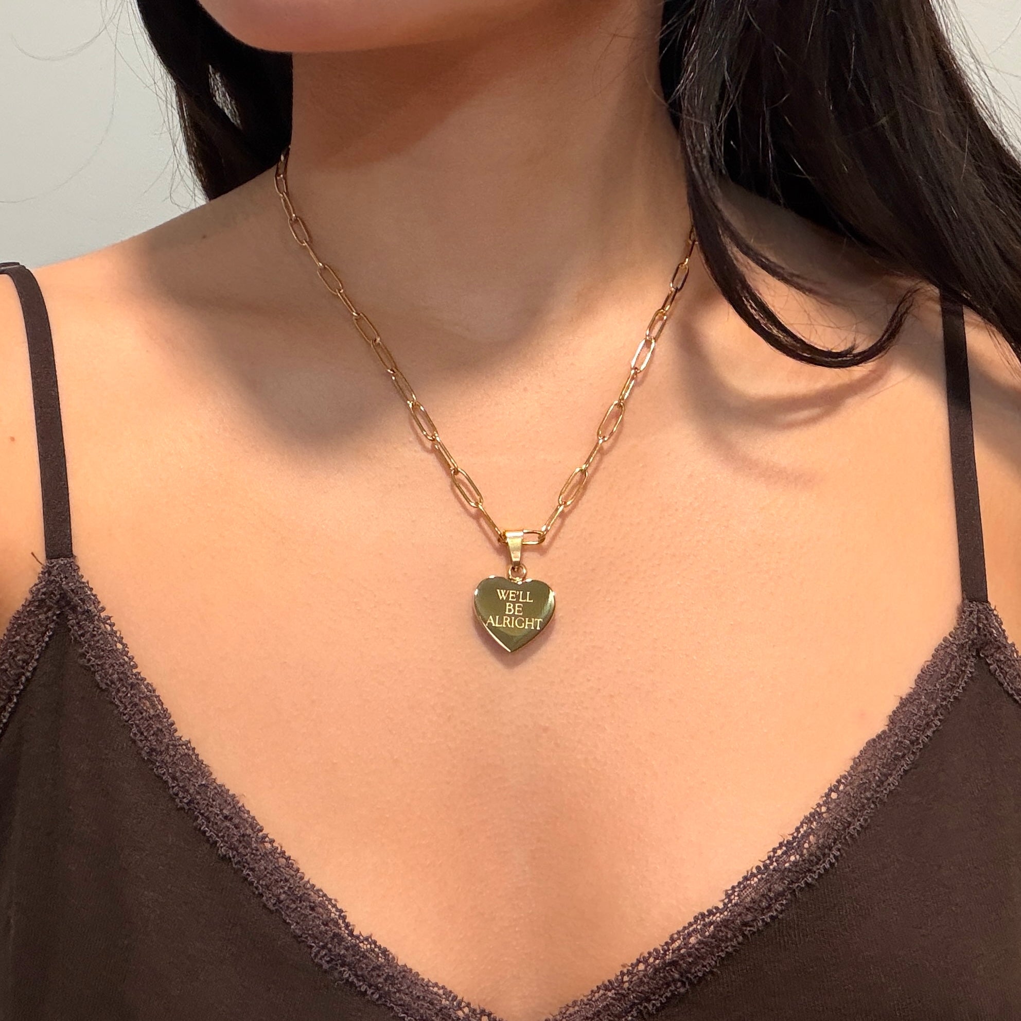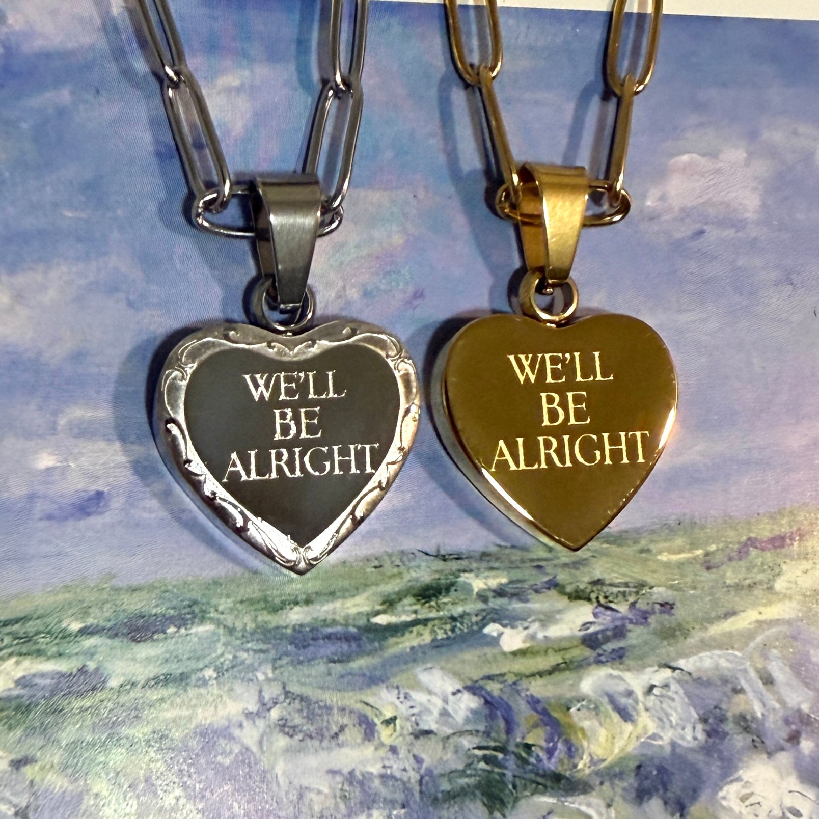 ✿Stainless steel paperclip chain necklace with 1 DOUBLE-SIDED pendant. One reversible heart pendant with the engraving “WE'LL BE ALRIGHT” on both sides, one side with a border & one side without a border. Comes in silver & gold. Perfect for all those who want this special line close to their hearts. *THIS IS NOT A LOCKET*